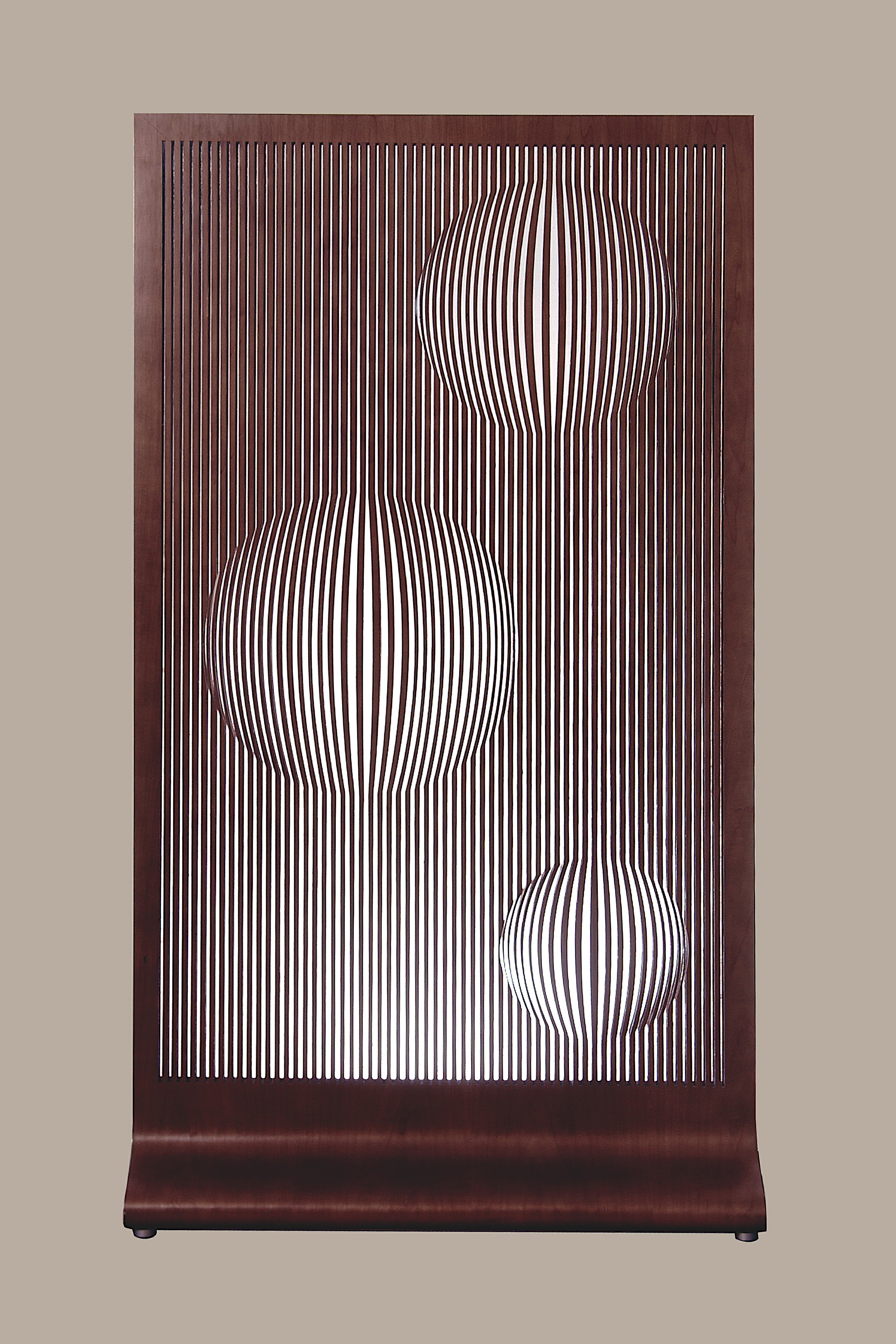Mitad Del Mundo means "the middle of the world" in Spanish, and refers to the location that marks where the equator passes in Quito, Ecuador. The equator is more than a simple geographical border: it has social and political consequences as well, and these evocative differences between the hemispheres are reflected in the piece.Mitad Del Mundo both conforms to and breaks down the traditional concept of a border. Despite its appearance as a solid barrier, it is also open and fluid, allowing communication and light to pass through its gaps. The real innovation of Mitad Del Mundo is its striking interference pattern. Viewed while in motion, the linear circles appear to be moving themselves, creating an exciting visual focal point in this striking work of art.