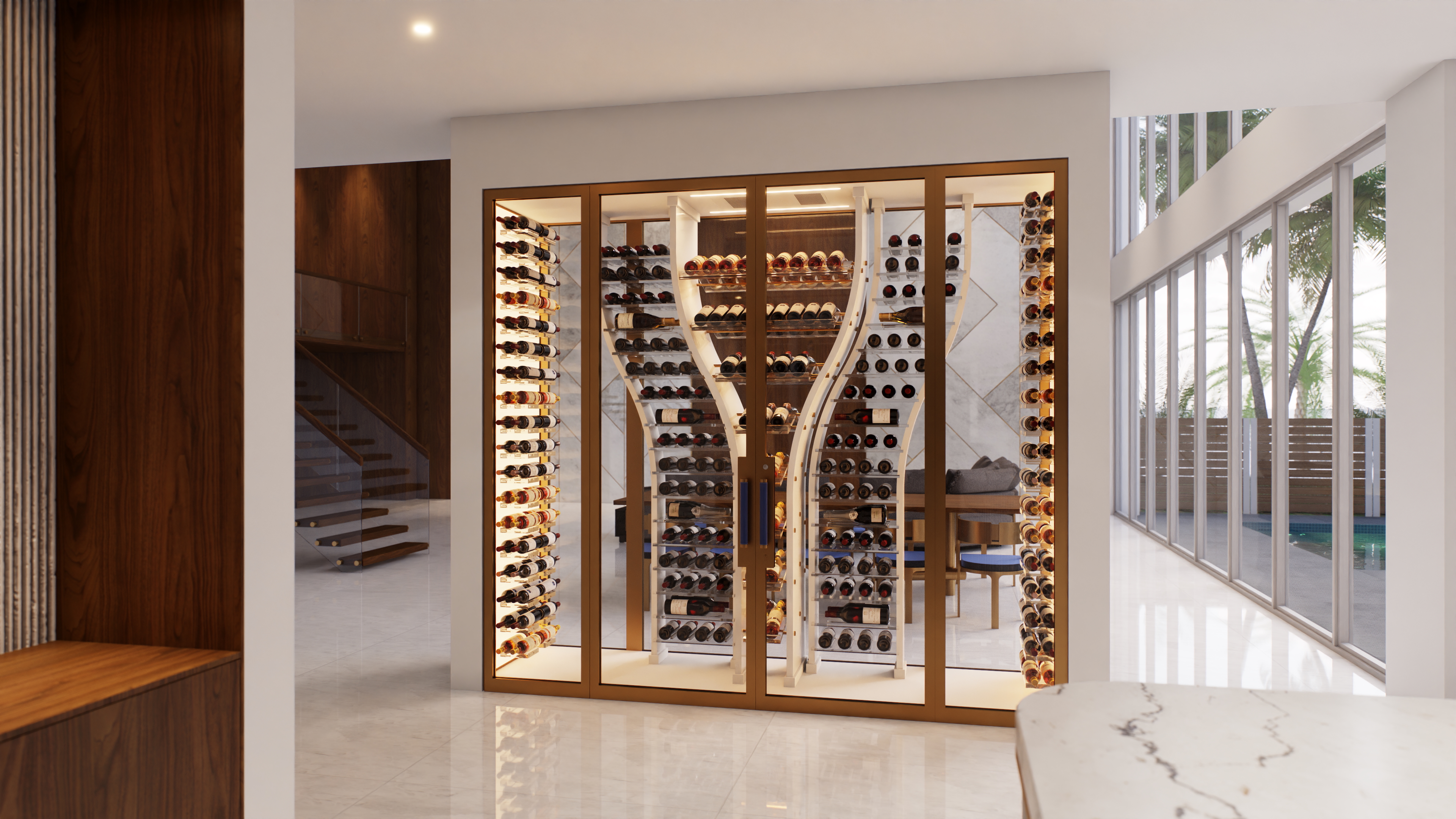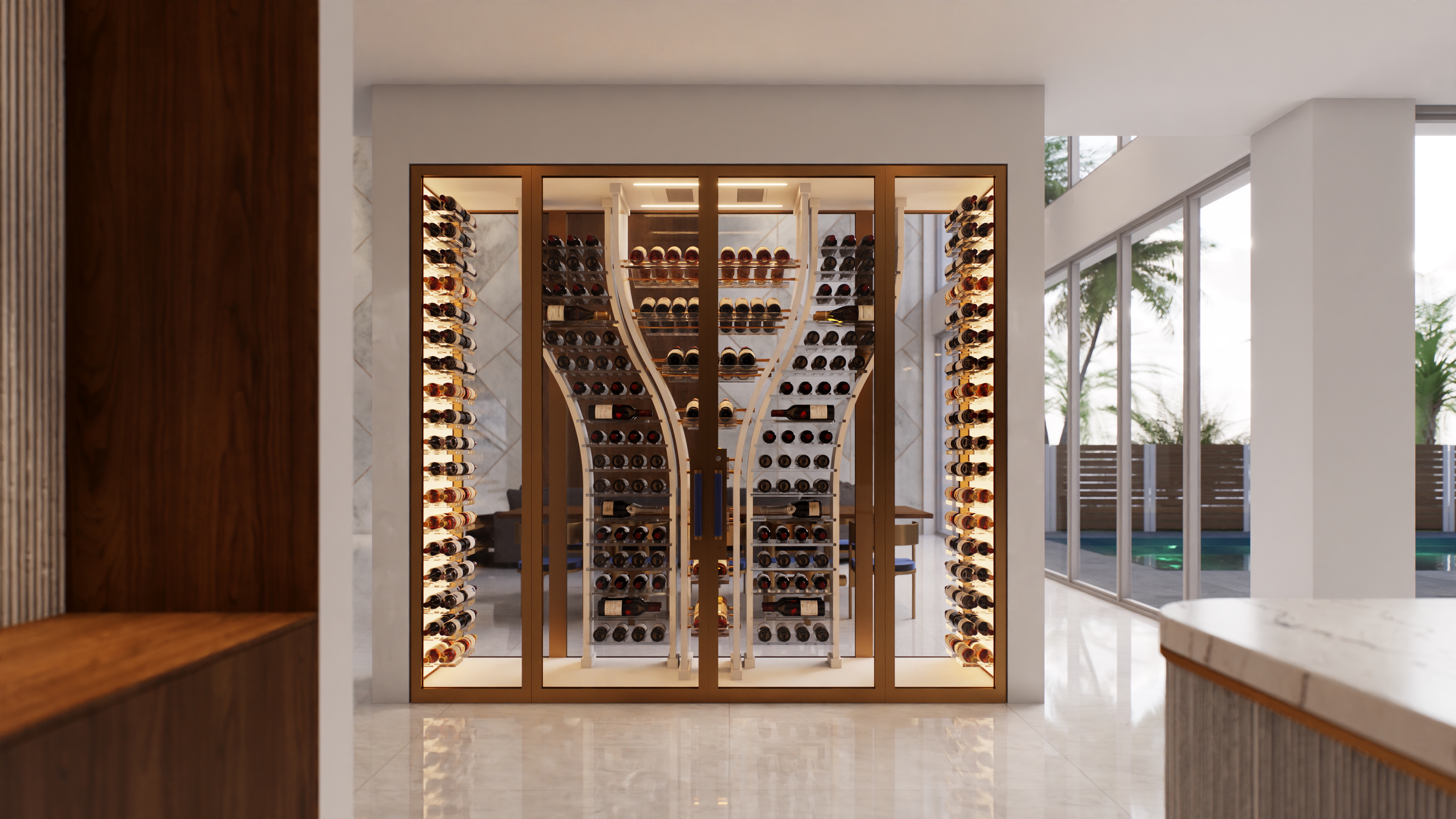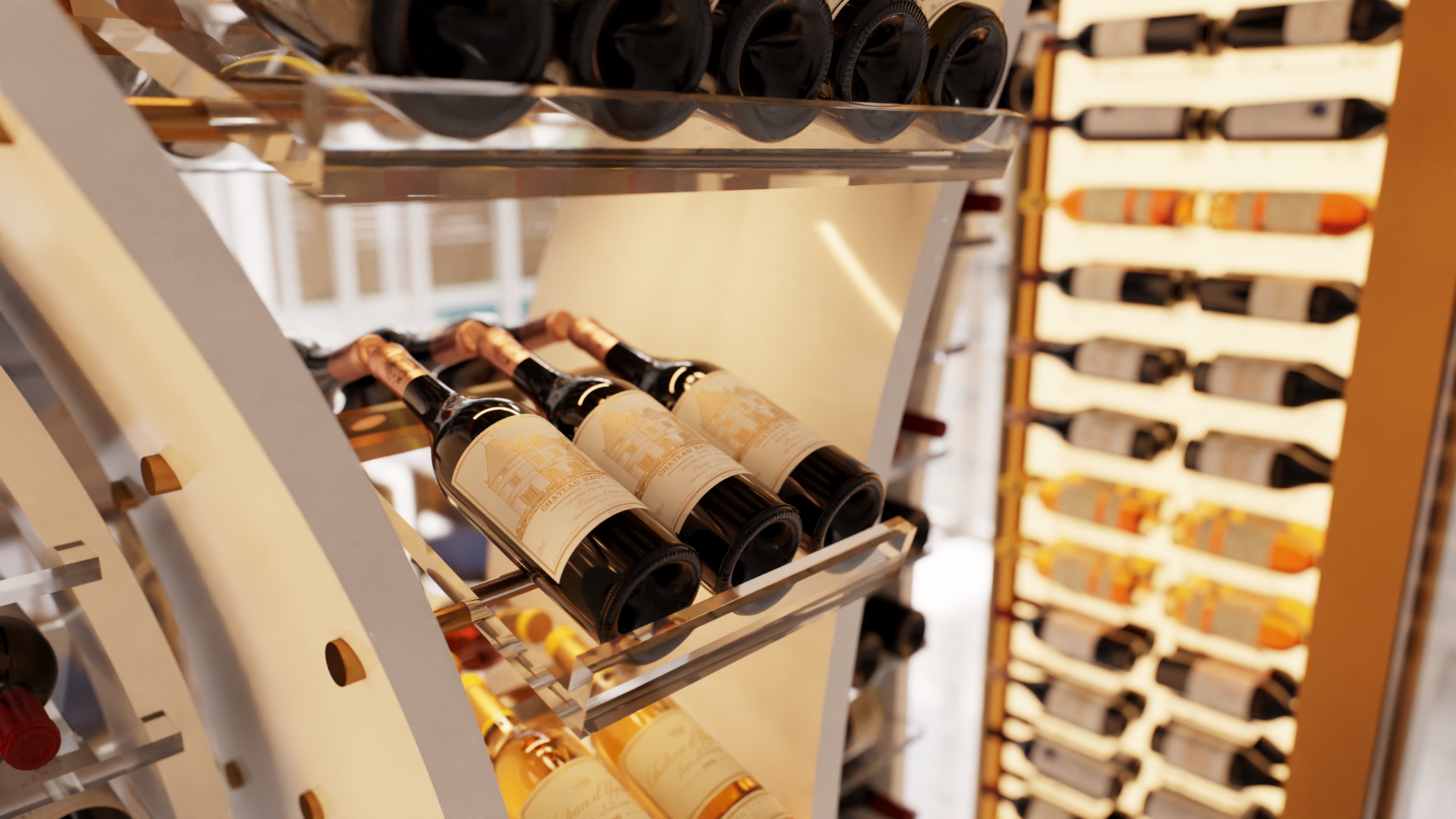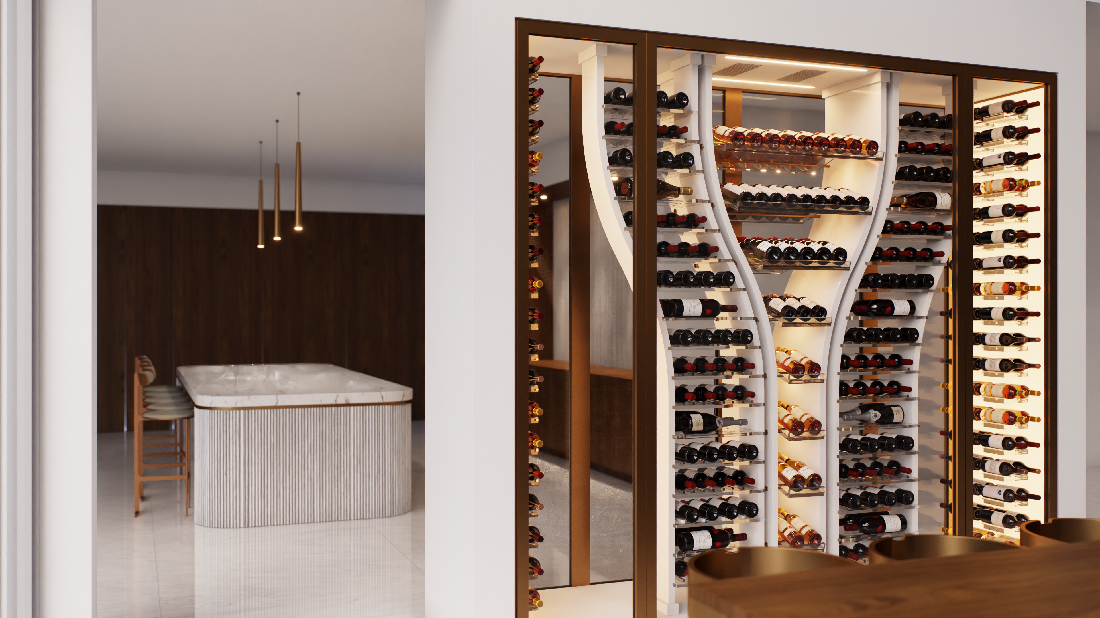 This project was conceived with utmost precision to offer an optimal wine storage experience while elegantly showcasing the bottles. With only two doors, both located on the same side, we had to minimize framing to maximize visual impact and ensure a clean, streamlined aesthetic. The central shape of the unit was specifically designed to free up the ends, facilitating access to the bottles while respecting the opening constraints.