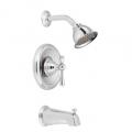 Features Handle inserts included Moentrol pressure balancing valve provides volume control for adjustable water flow features M-PACT common valve system includes adjustable showerhead, arm and flange with diverter tub spout classic lever handle distinctive styling matching suite of products available