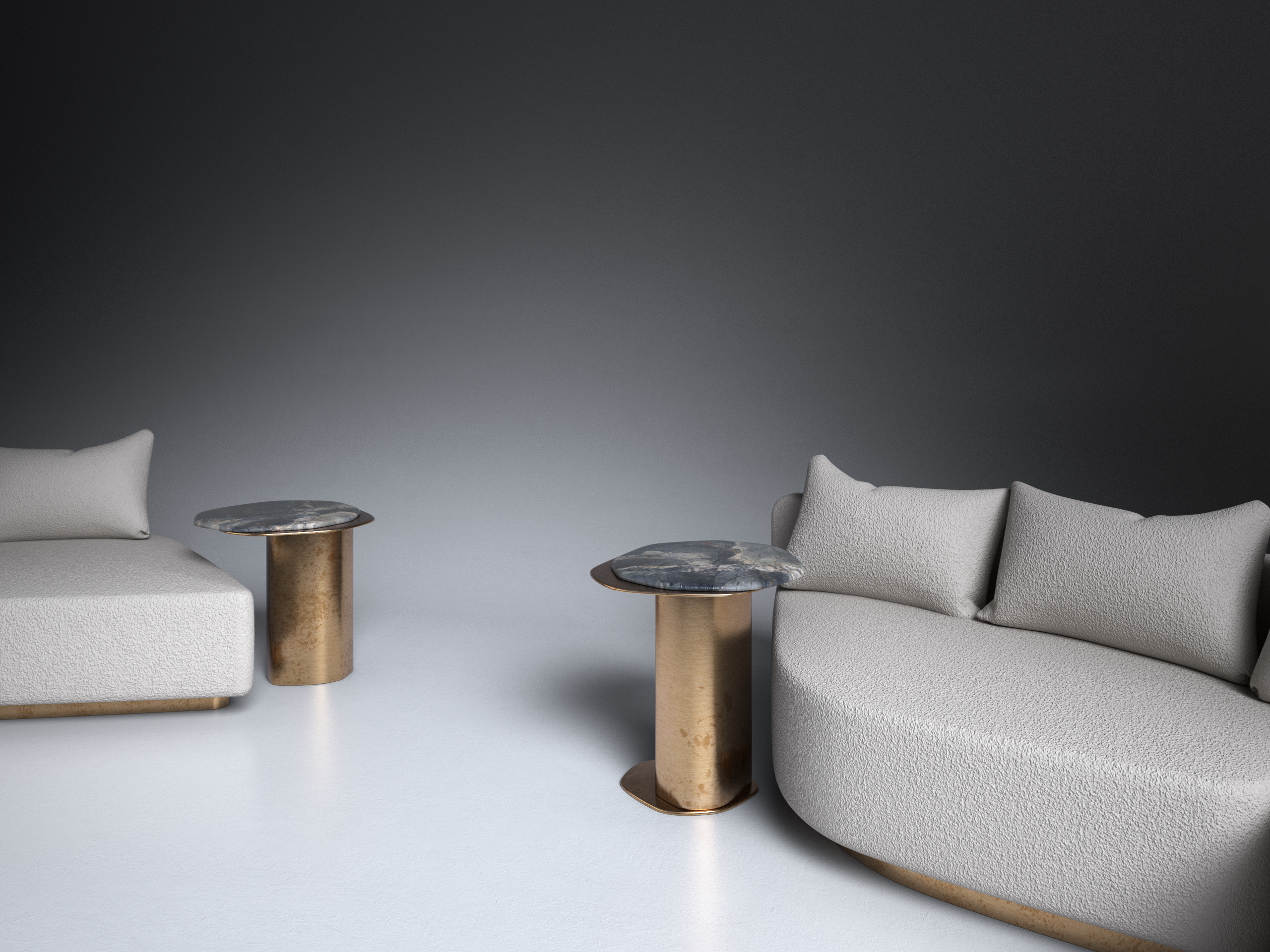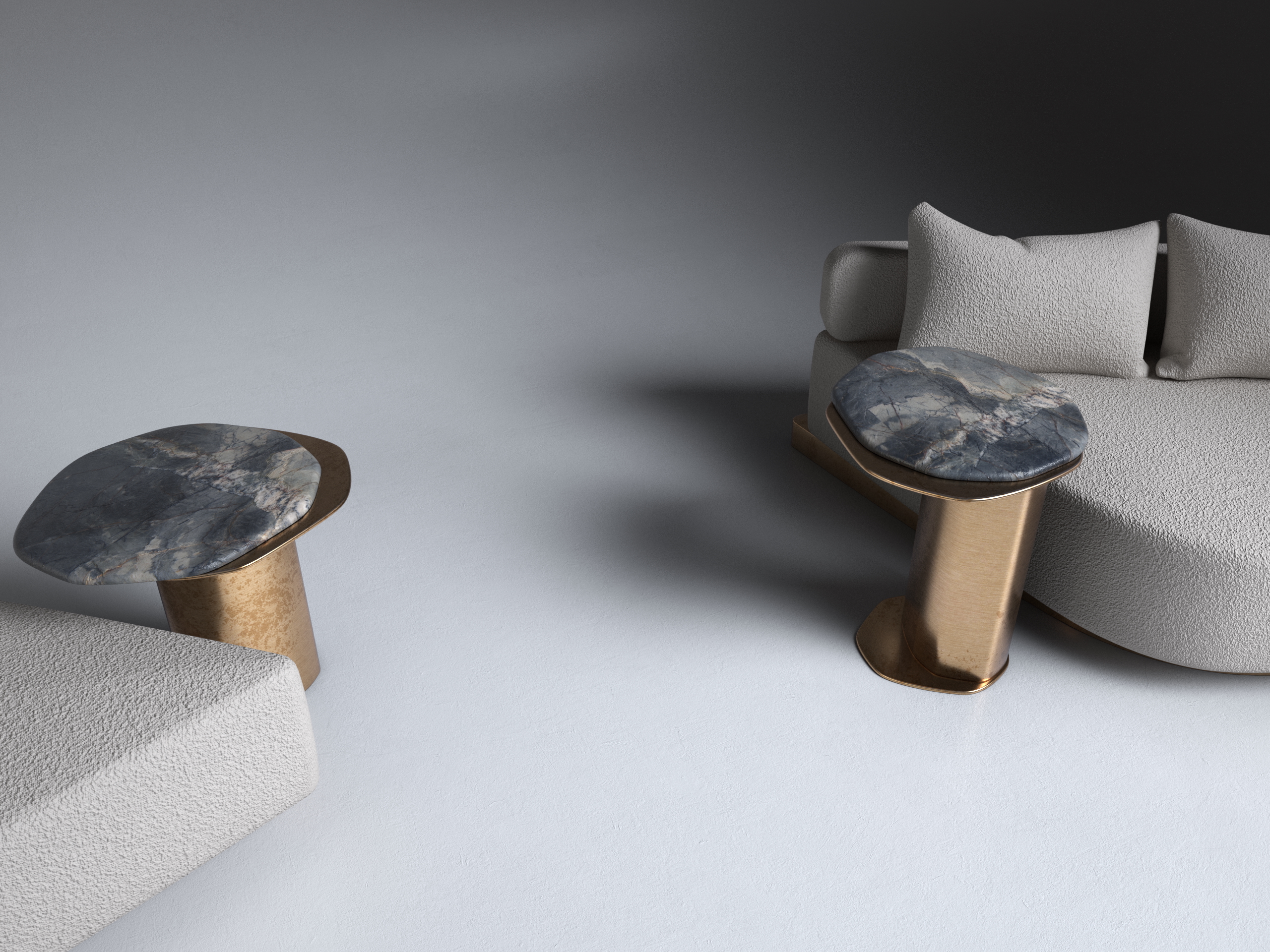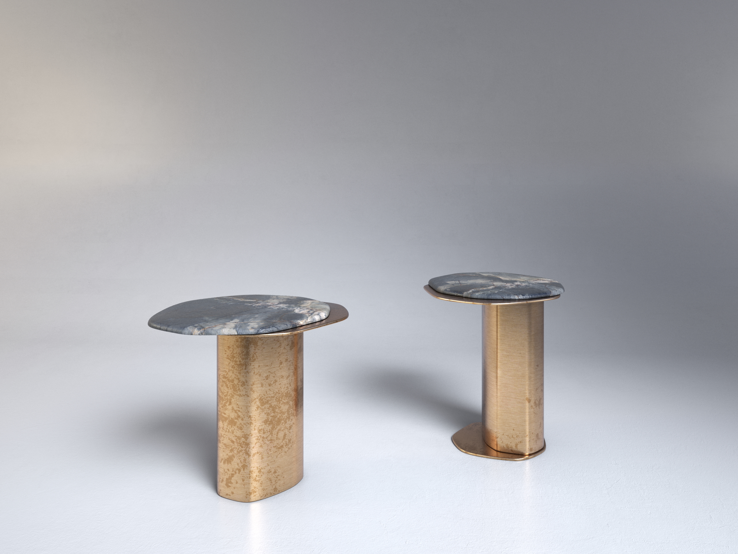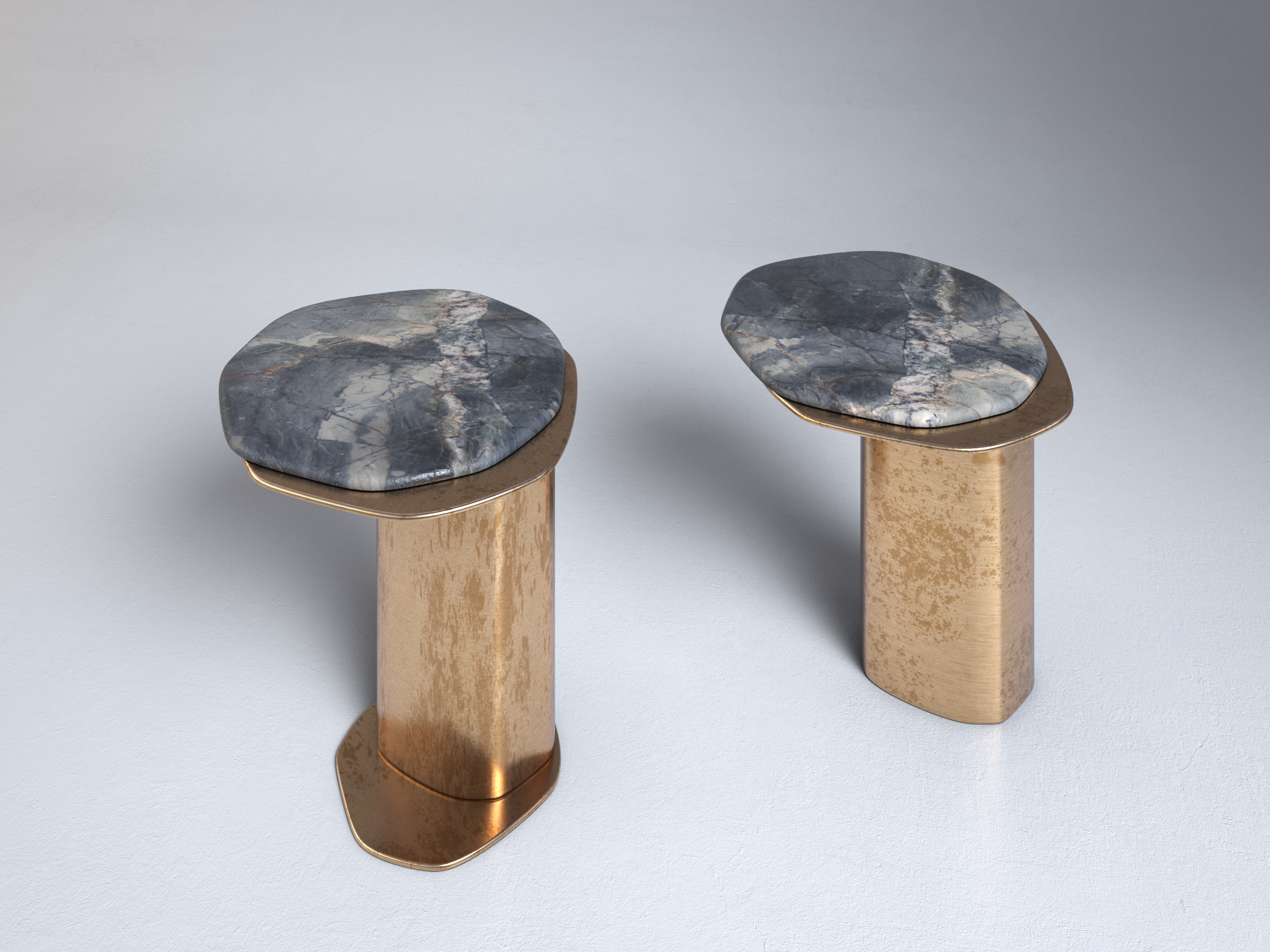 The EPICURE XIII Contemporary Side Tables ft. natural quartzite and solid brass in “Antique Satin” finish