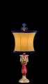 If you think this lamp is outrageous, you should see our matching Mardi Gras chandelier. We have festooned this accent table lamp with vintage travertine beads and topaz crystal icicles. The handcut red crystal vase vies for attention with the pinched drum shade in dark gold velvet. Handcut sapphire crystal pendeloque and exuberant scrollwork form the extravagant finial. 26" high. Heirloom Gold finish. Built-in dimmer switch.