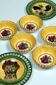 Introducing two new product offerings from The Gathered Garden for the Ryan Gainey Collection. Set of 4 fruit plates richly decorated with grape, strawberry, blackberry & fig imagery-can be enjoyed both on and off the table.. Colorful soup bowl with eggplant, artichoke & red onion design in center well and basket-weave detailing. 700506 Soup Bowl 2.5" H x 7" D 700507 Set of 4 Fruit Plates 10" D