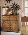 Gallery rail at back of top. Four drawers with silver insert in top right drawer and liner pad in top left drawer. One adjustable wooden shelf behind doors. Item Number: 017-504 Dimensions: 39.5" x 45.25" x 18.5" (WxHxD) Finish: Waxed Pine