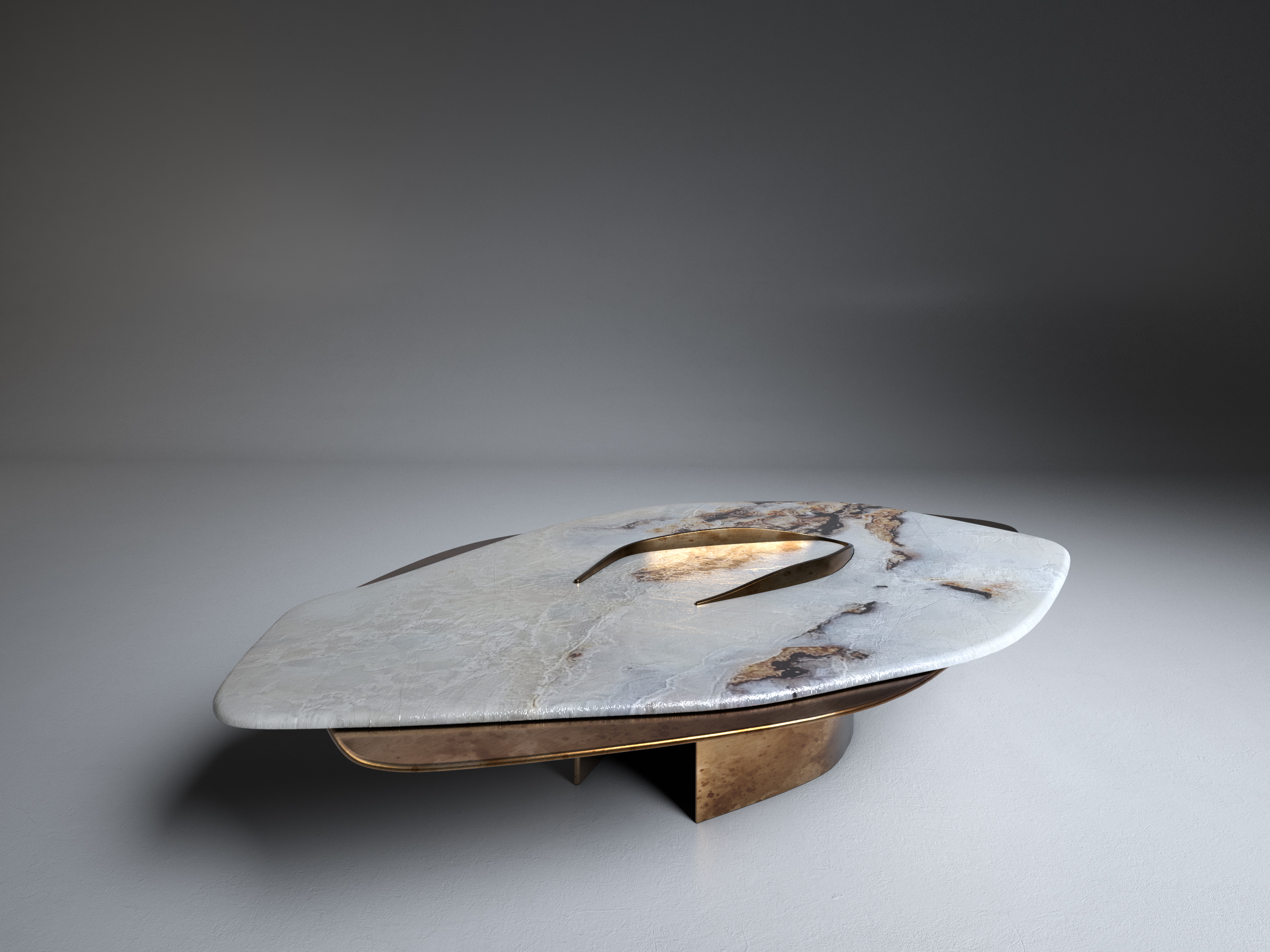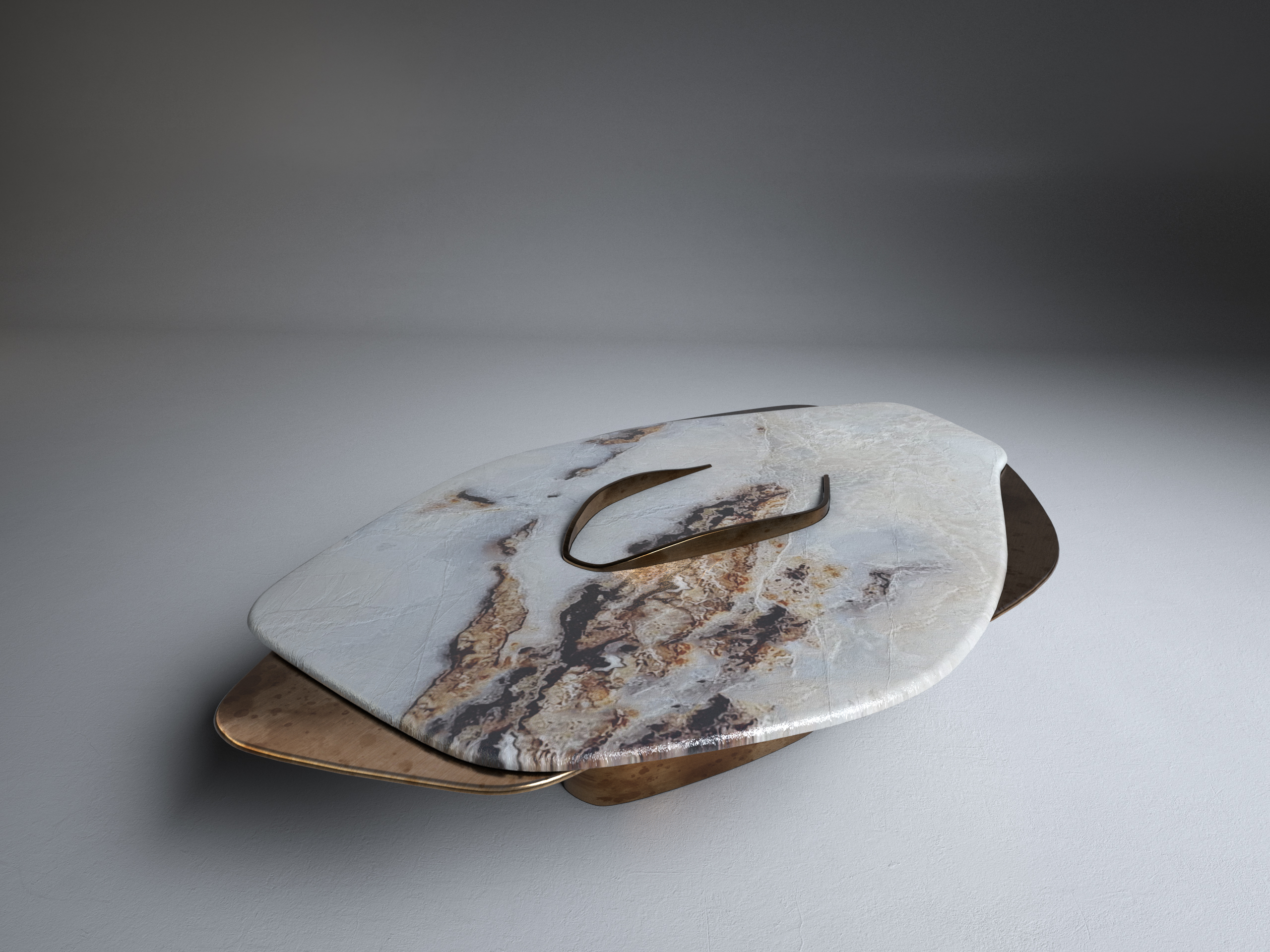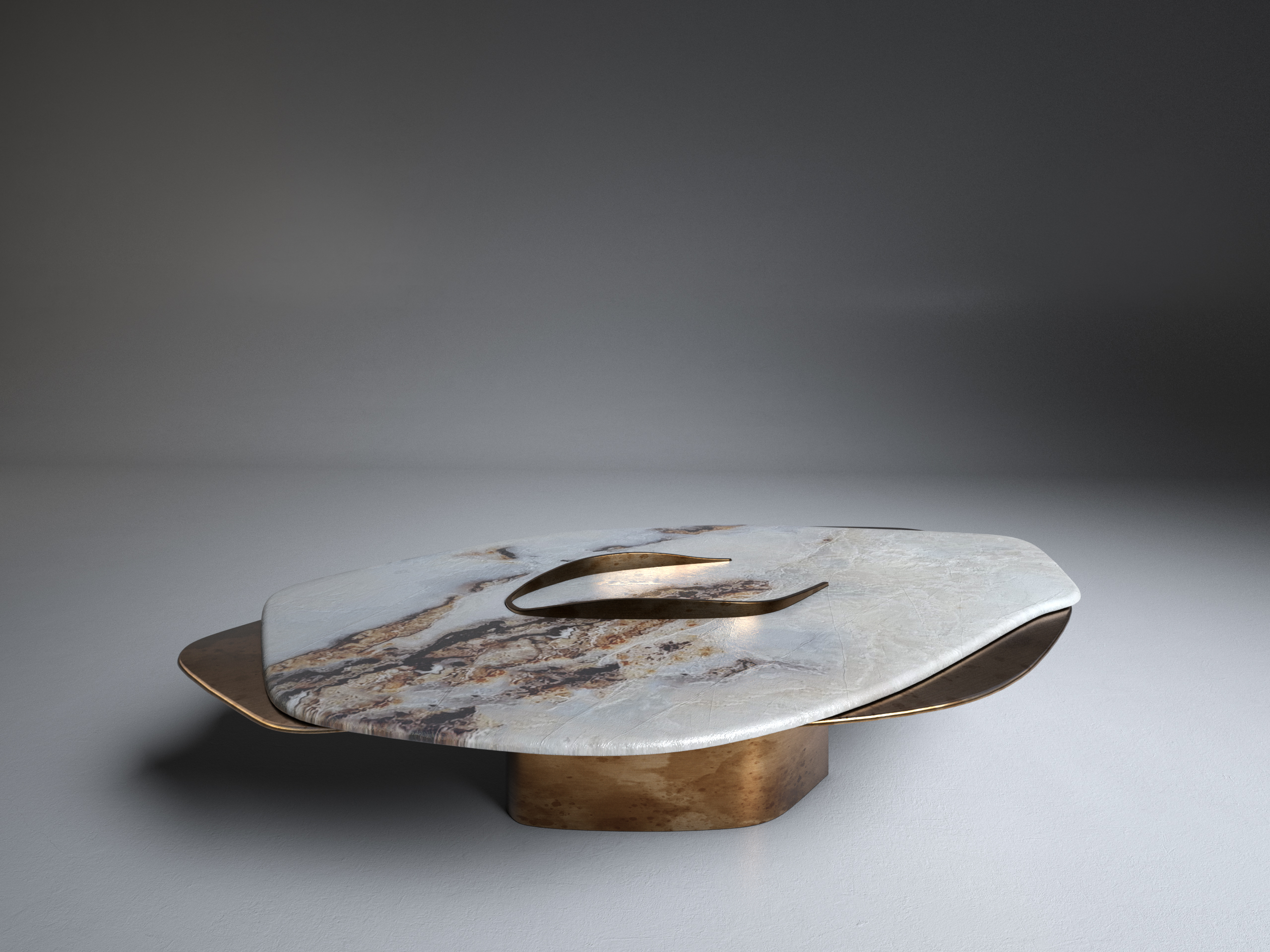FELINE X Contemporary Coffee Table ft. White Onyx and solid brass elements in "antique satin" finish