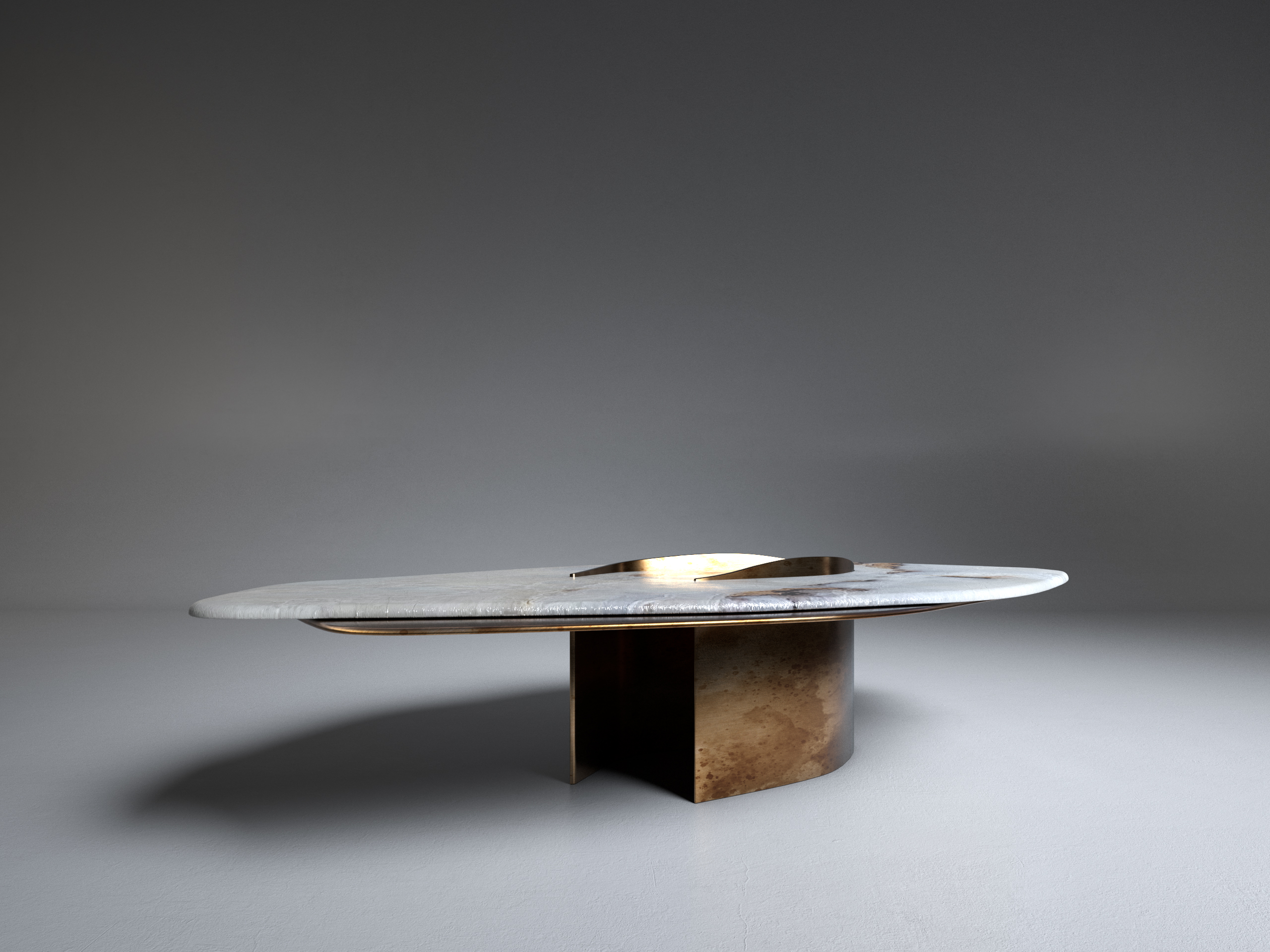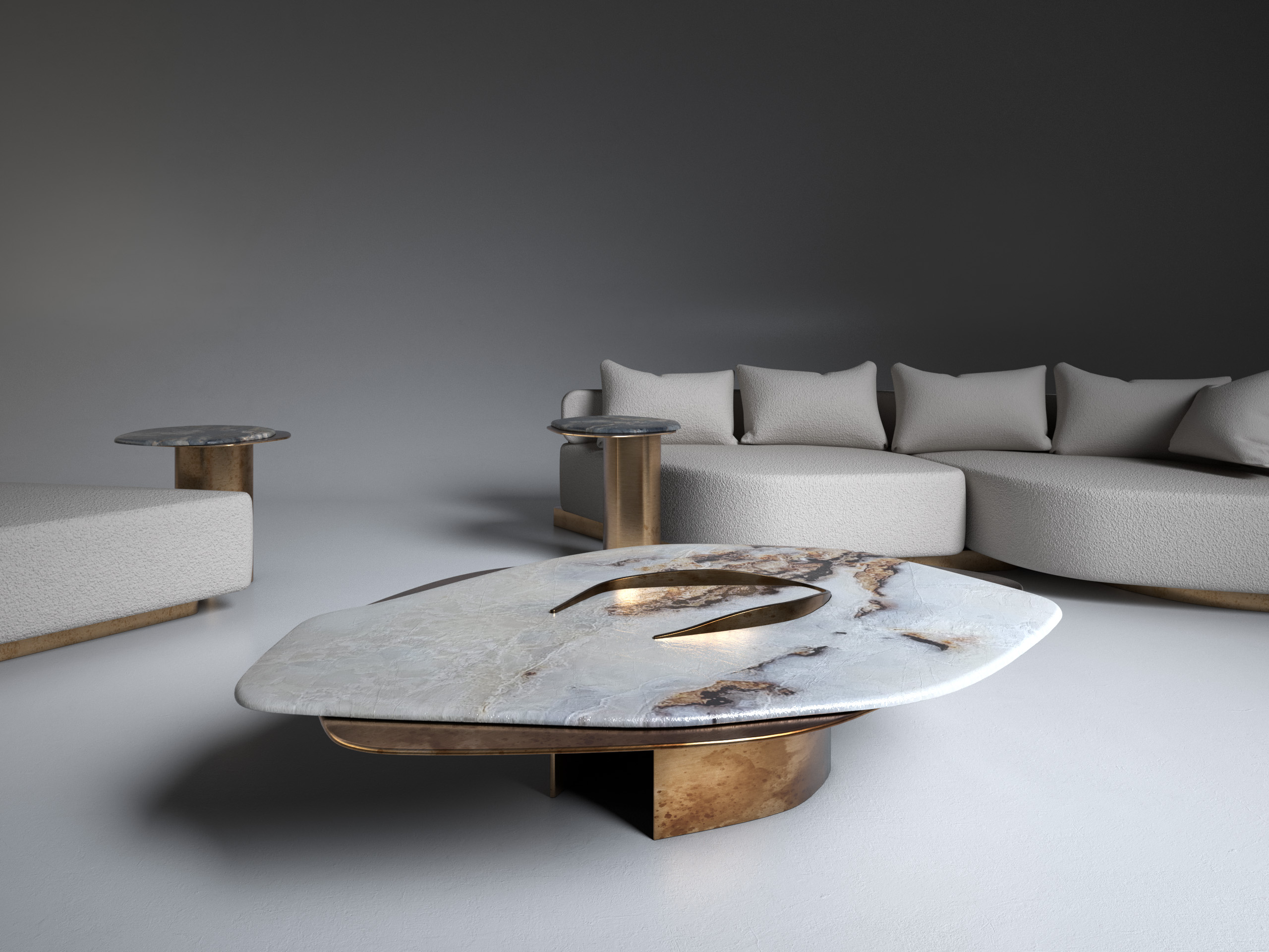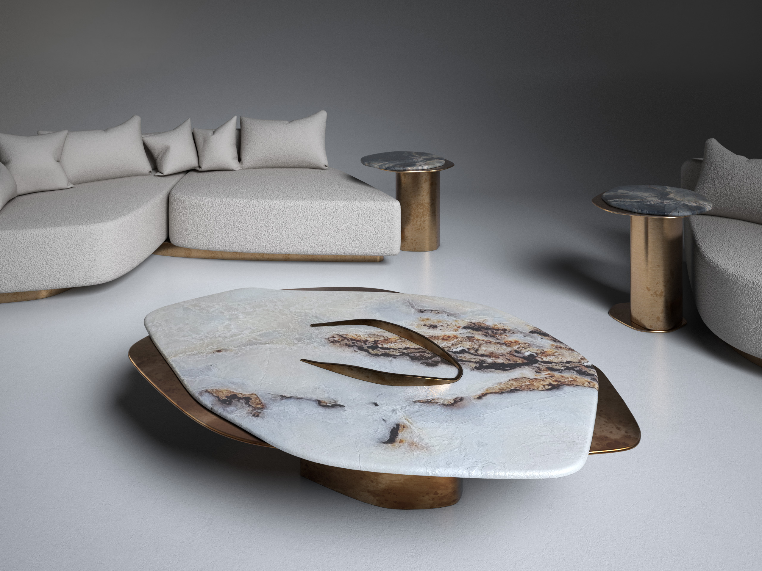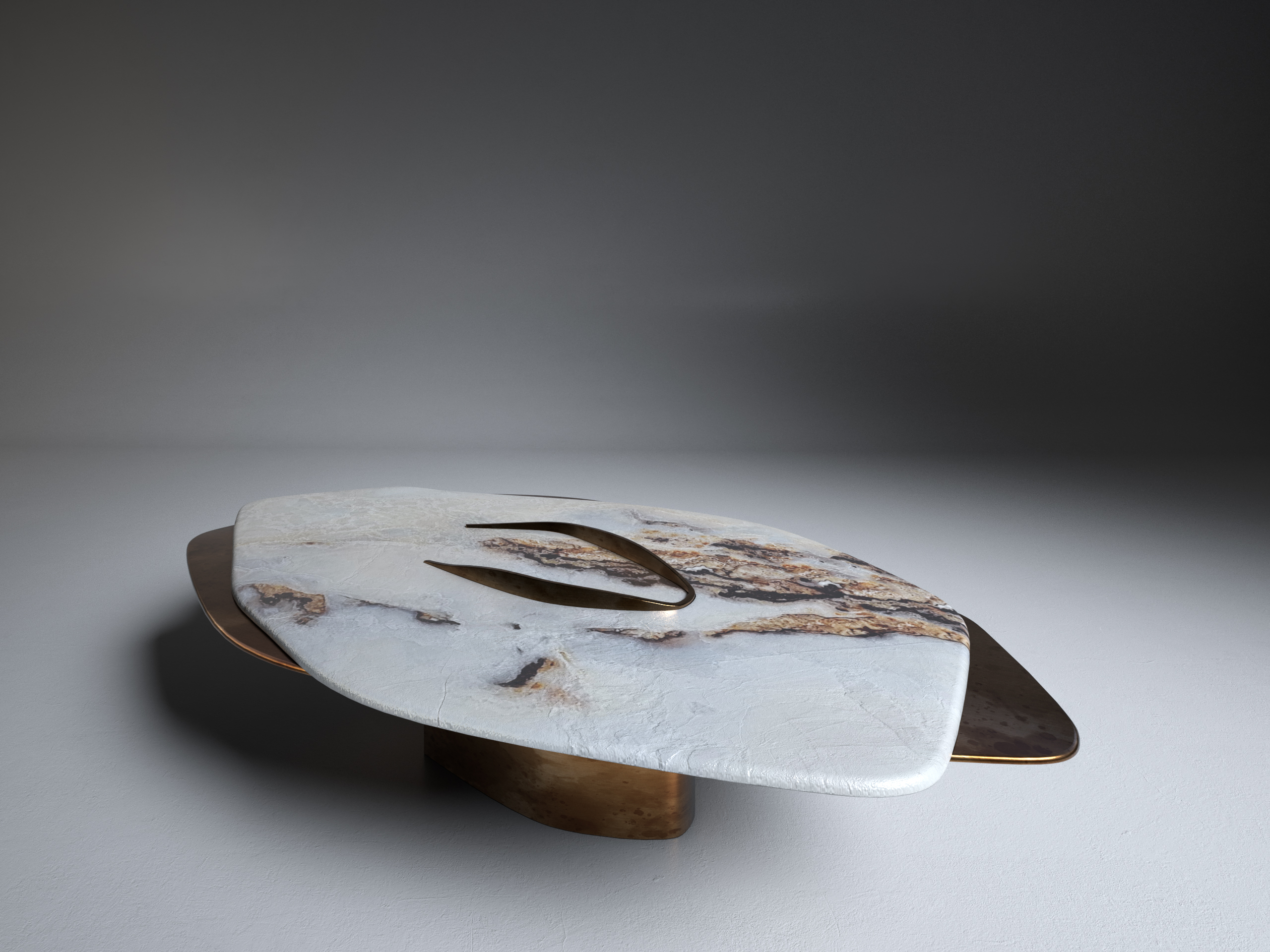 FELINE X Contemporary Coffee Table ft. White Onyx and solid brass elements in "antique satin" finish