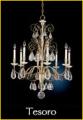 Tesoro means “treasure in Italian, and this Schonbek chandelier was designed to display treasures from the Earth.Pendants of rare rock crystal hang like ripe fruit from the slender frame by means of tendril-like hand-formed loops. The finial ornament is a massive rock crystal ball. Even the bobeches beneath the hand-cast candle cups are hand-carved of rock crystal. Our private sourcing of gem-quality rock crystal has been an adventure well worth it, because it's enabled us to re-introduce rock crystal to contemporary collectors who can appreciate its marvels.