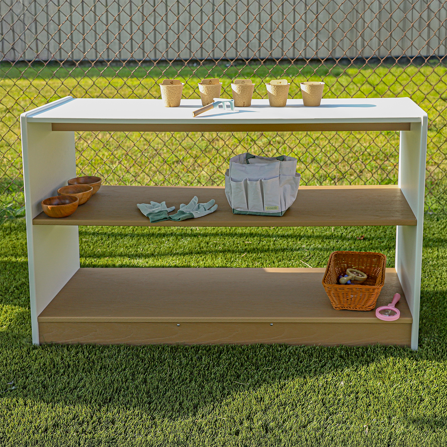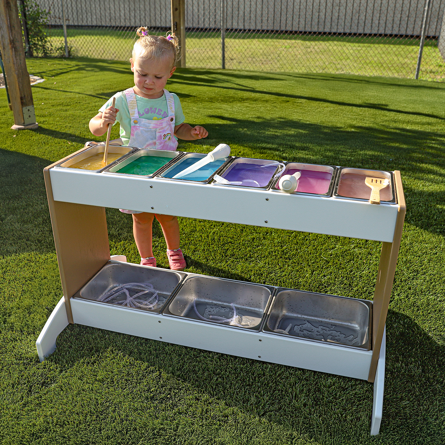 The outdoorED™ collection is positioned squarely at the intersection of Science and Outdoor Learning. Ten individual pieces including three unique sensory stations, a mud kitchen, market stand, bench seating, open shelving and activity table combine to support the specialized developmental needs of preschool and kindergarten aged children. The wide range of purpose-built furniture enables an outdoor early learning environment that supports STEM / sensory, literacy development, imaginative play, social seating, storage and quiet sanctuary can be furnished completely within the collection.