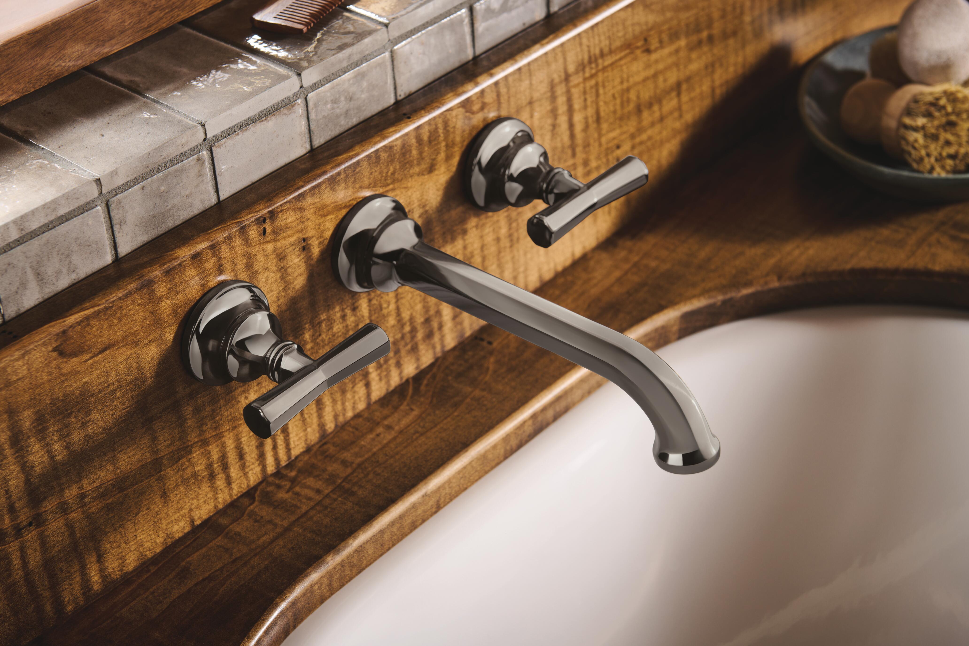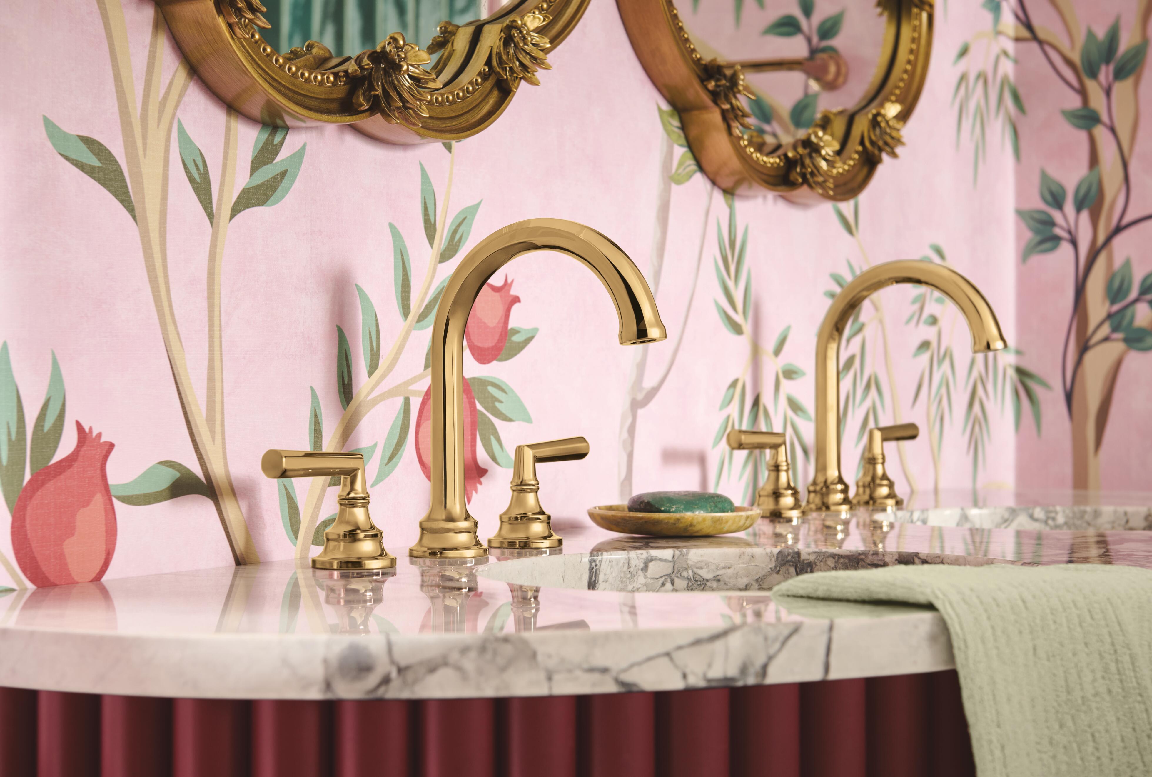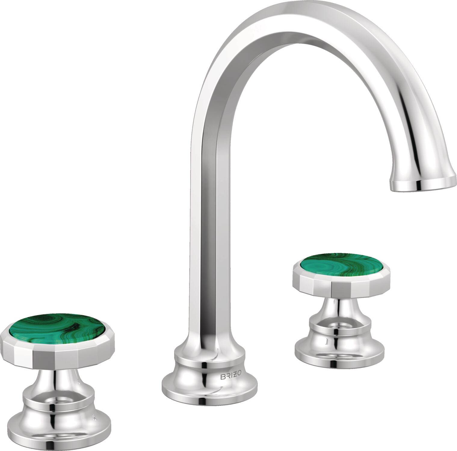 The collection offers six distinctive finishes—Polished Chrome, Brilliance® Polished Nickel, Brilliance® Luxe Nickel, Brilliance® Polished Gold, Brilliance® Luxe Gold, and the striking Brilliance® Black Onyx. T— the faceted Wheel, the sculptural Lever and the T-Lever — provide additional opportunities for personal expression. A true centerpiece, the malachite faucet handle inlay showcases striking bands of bright and dark green, creating a captivating pattern. Celebrated for its rarity and enduring association with luxury, malachite ensures that no two inlays are alike, with each handle possessing an allure entirely its own.