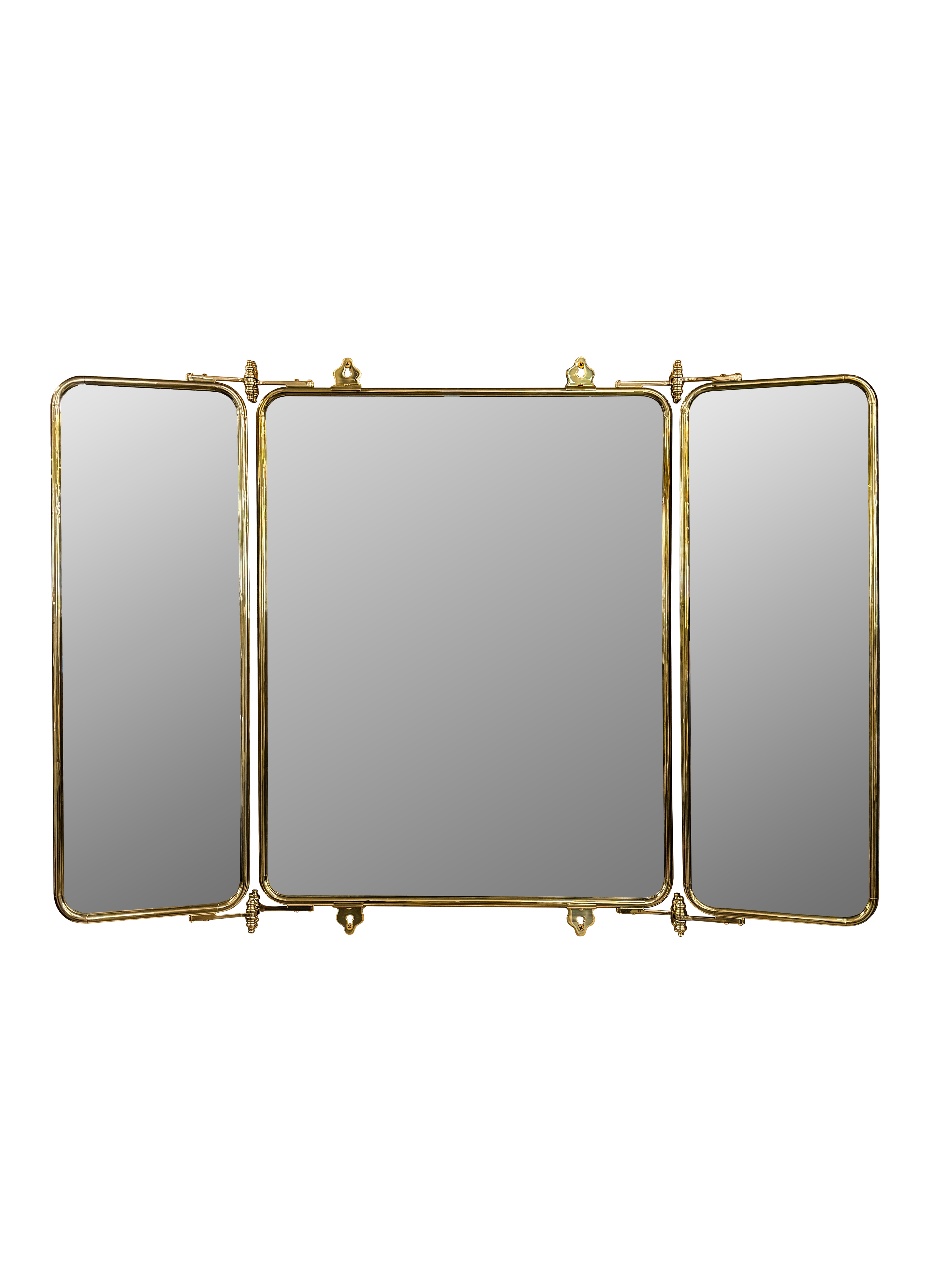 The Tri-Fold Mirror is a perfect addition to any luxury bath space. The side mirrors swing in and out 180º allowing for a full range of motion. Shown in brass.