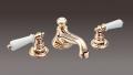 Mayfair widespread lav faucet w/Mayfair porcelain lever handles in Perma Brass.