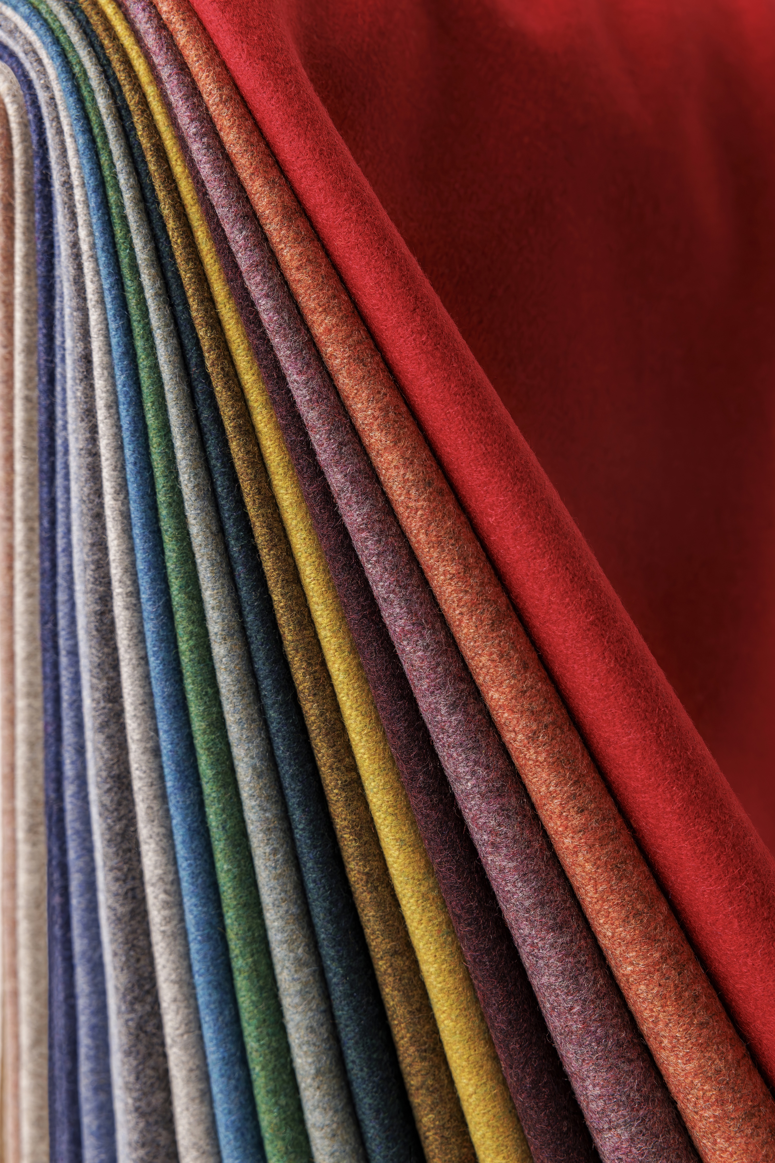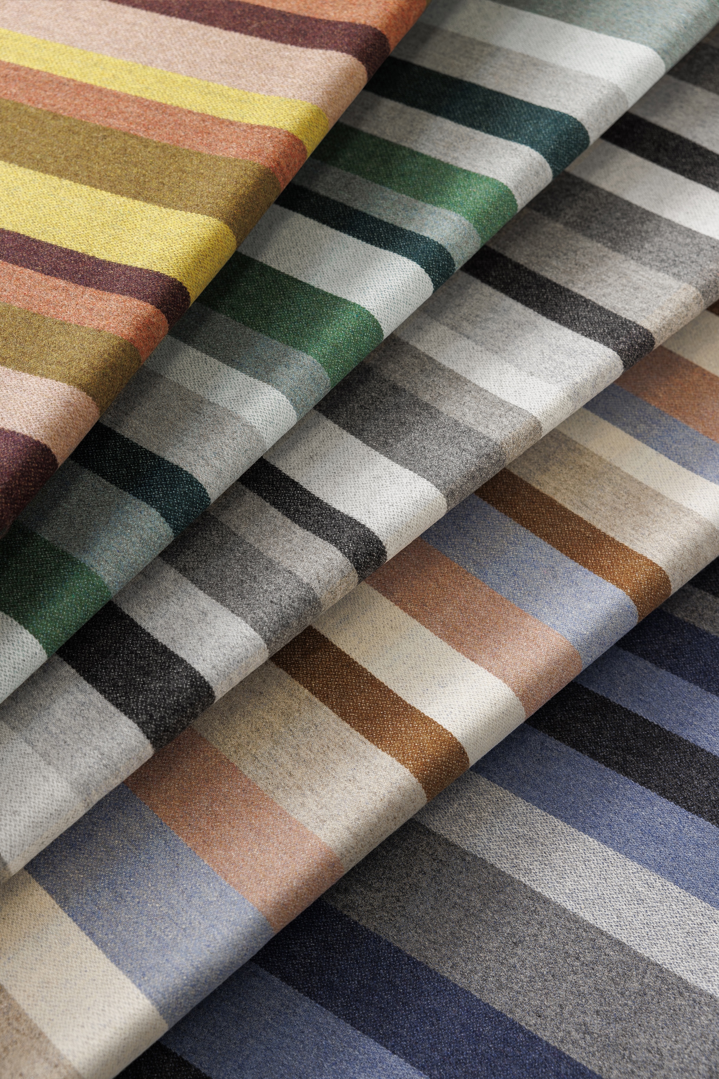 on Luum’s recycled garment waste platform, pre-and-post consumer recycled wool garments are sorted, shredded, dyed, re-spun into yarns and woven into a new textile, diverting waste from the landfill. Featuring 22 hues, Stability’s color range relates with Forward Motion, its multi-color stripe coordinate.