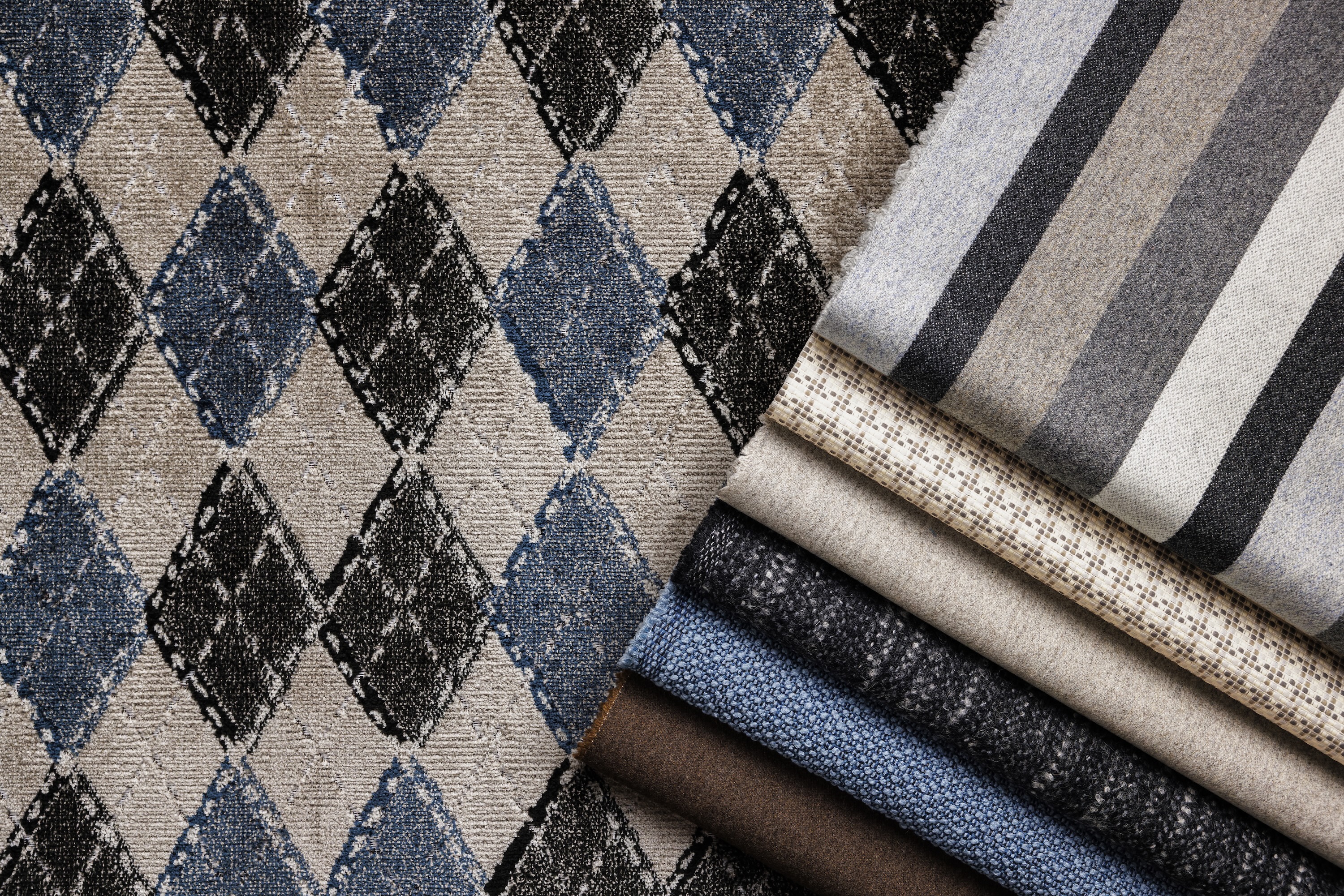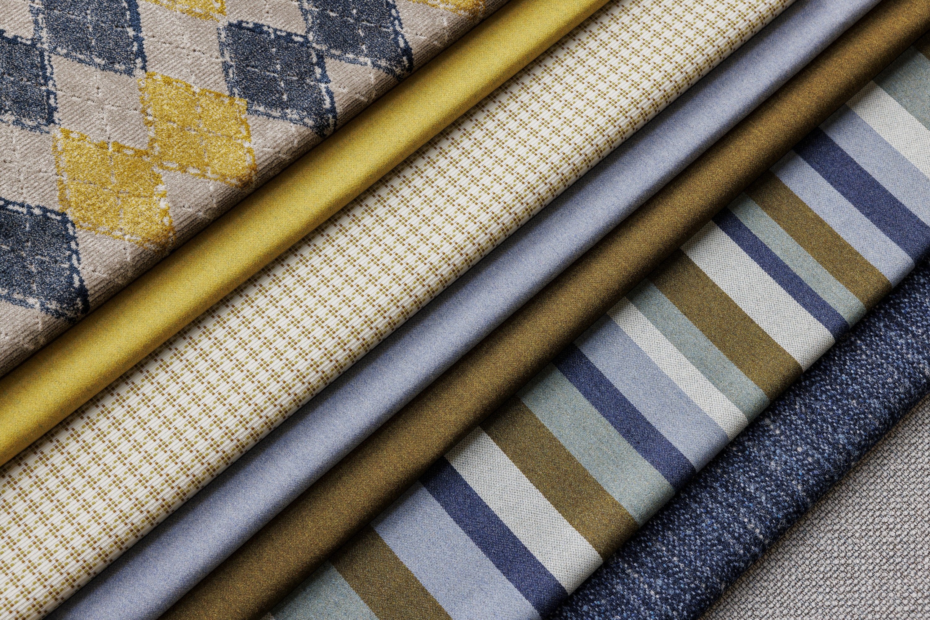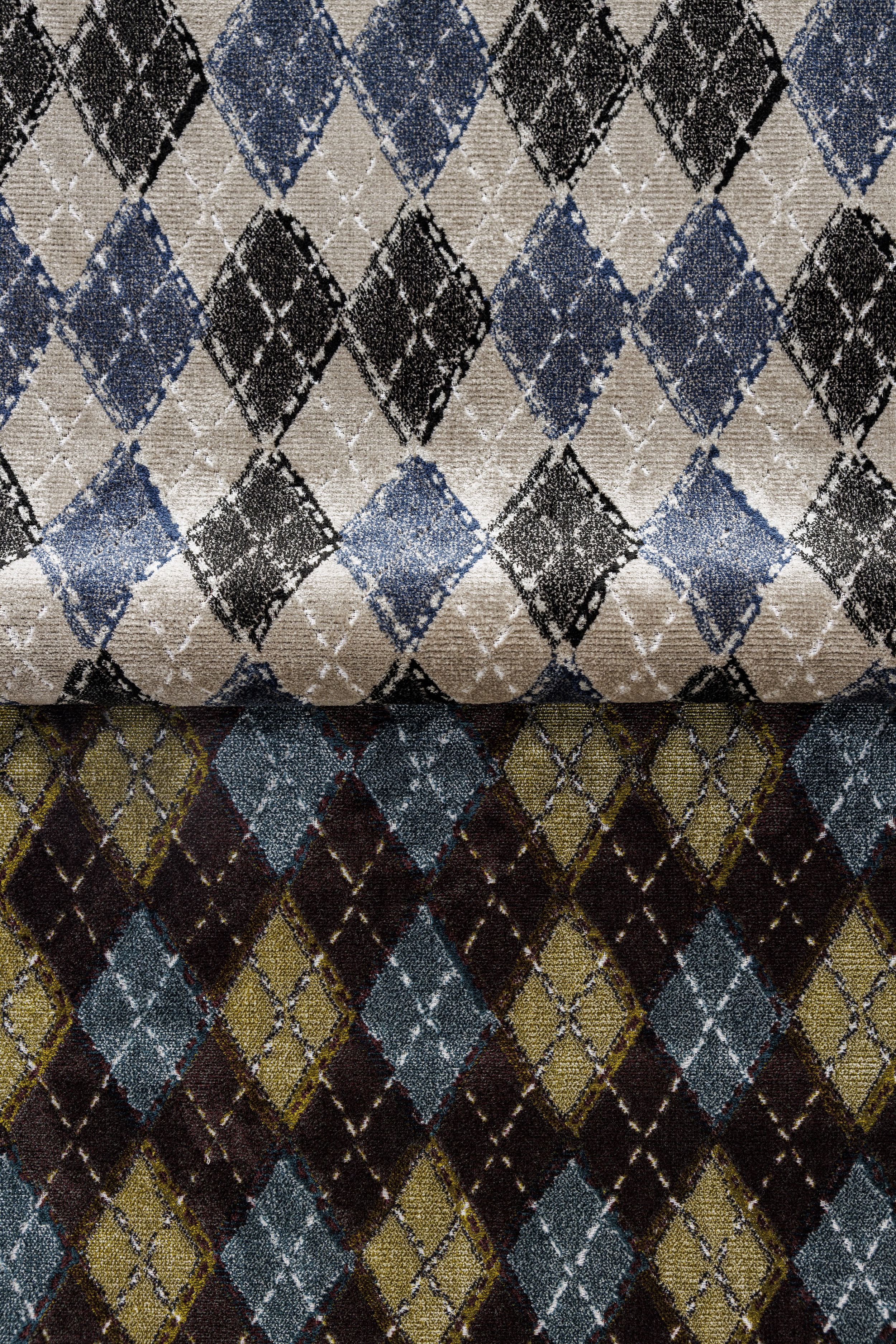 Oblique Argyle: Oblique Argyle’s nostalgic multicolor argyle pattern, combined with its three-dimensional specialty velvet pile, contain unexpected hue combinations - moving this classic knitwear motif in a more decorative and playful direction. The jacquard velvet is woven in two layers, joined together by the multicolored warp threads as they raise and lower to create the complex design. As the fabric comes off the loom, the layers are separated by a knife edge to reveal the pattern’s luxurious, silky texture. Oblique Argyle is bleach cleanable and suitable for hospitality, workplace and residential applications.