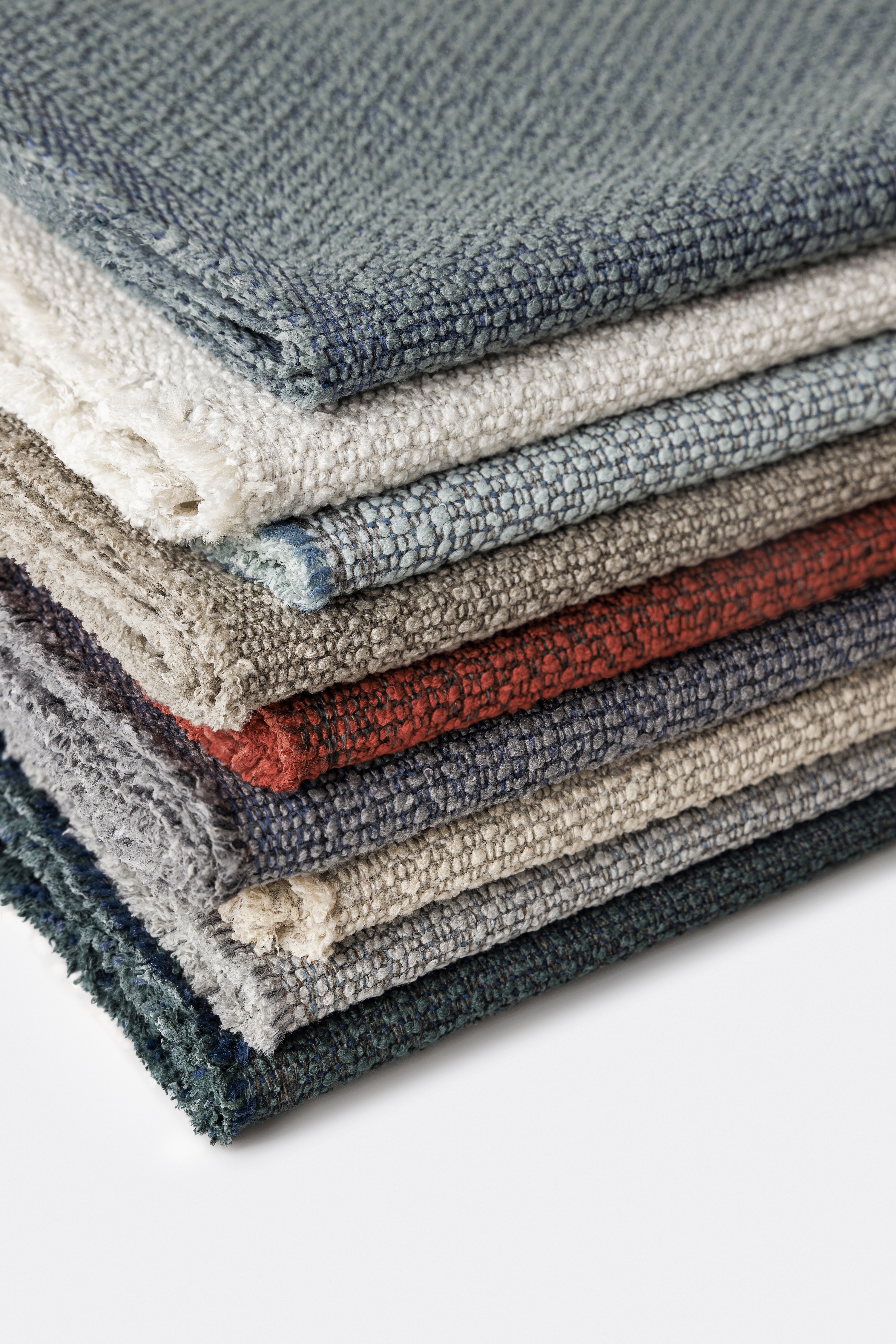 of dimensional neutrals and grays, as well as fiery red and minty blue to create a cohesive interior.