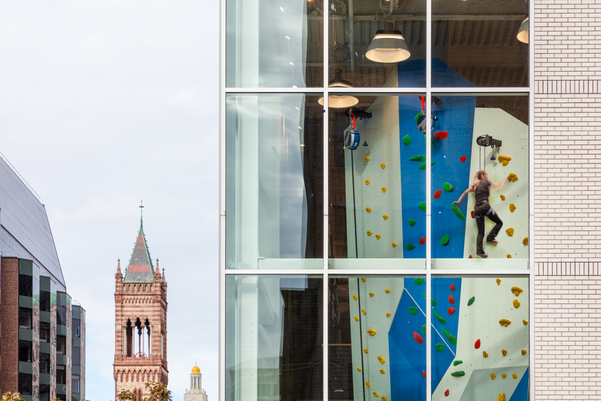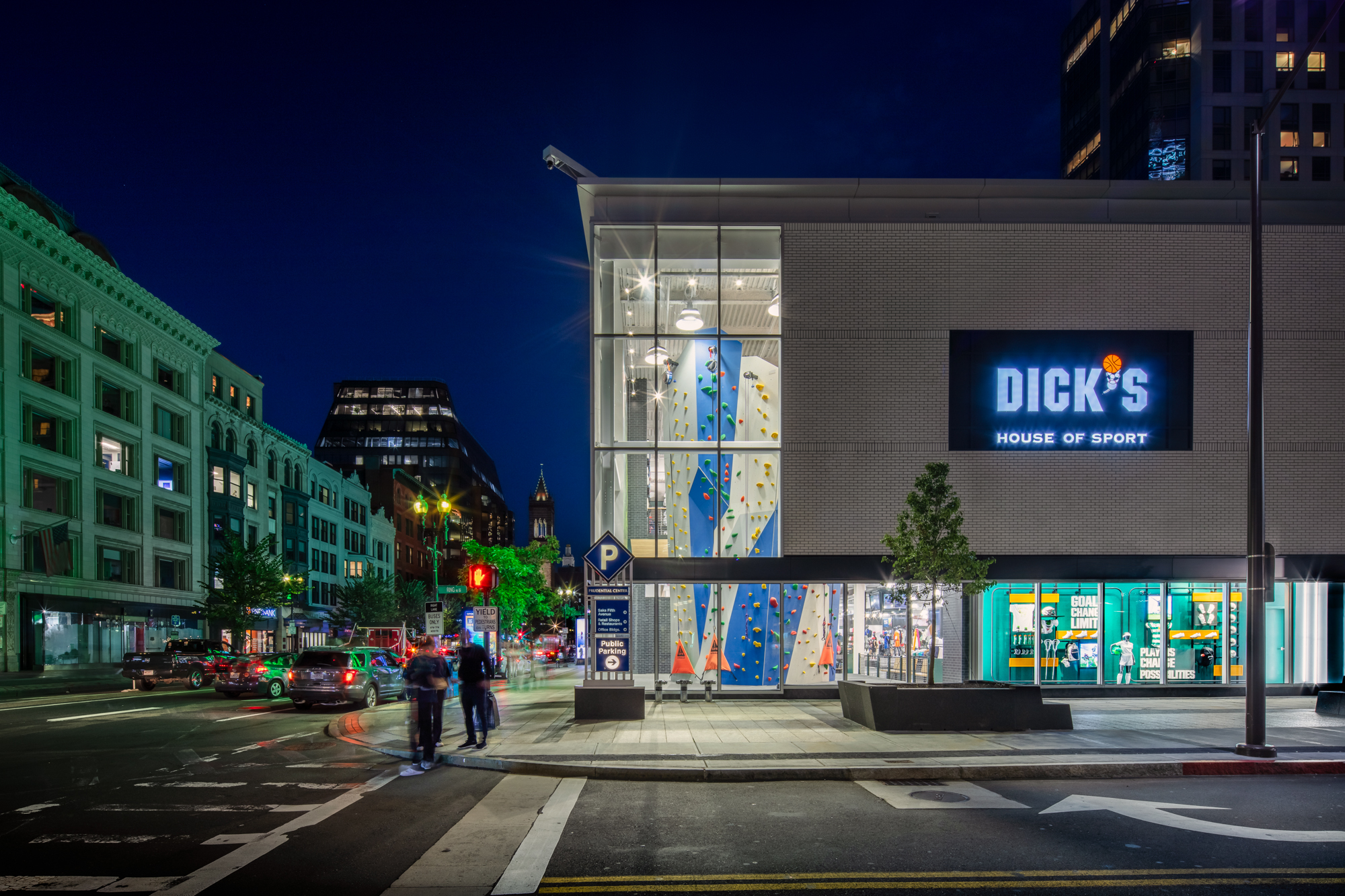 Boston is an iconic sports town, with ballparks, arenas, and stadiums immediately recognizable worldwide. In the same way, the new Dick’s House of Sport Boston stands as a home to celebrate athletes, comparable to those revered sports venues. The design of the new façade, while a celebration of Dick’s iconic features, was enhanced through the integration of thoughtfully contextual unique elements and materiality that feels at once new and familiar to the neighborhood. Architecturally, there’s subtle reference to the beloved Fenway Park and the old Boston Garden. Along Boylston St, color changing windows offer a nod to local sporting events, glowing green, red, blue, or yellow on any given day. At the prominent corner of Boylston St and Ring Road, windows run sidewalk to roof, forty feet tall, highlighting a multi-story climbing wall just inside... and that’s where the fun really begins.