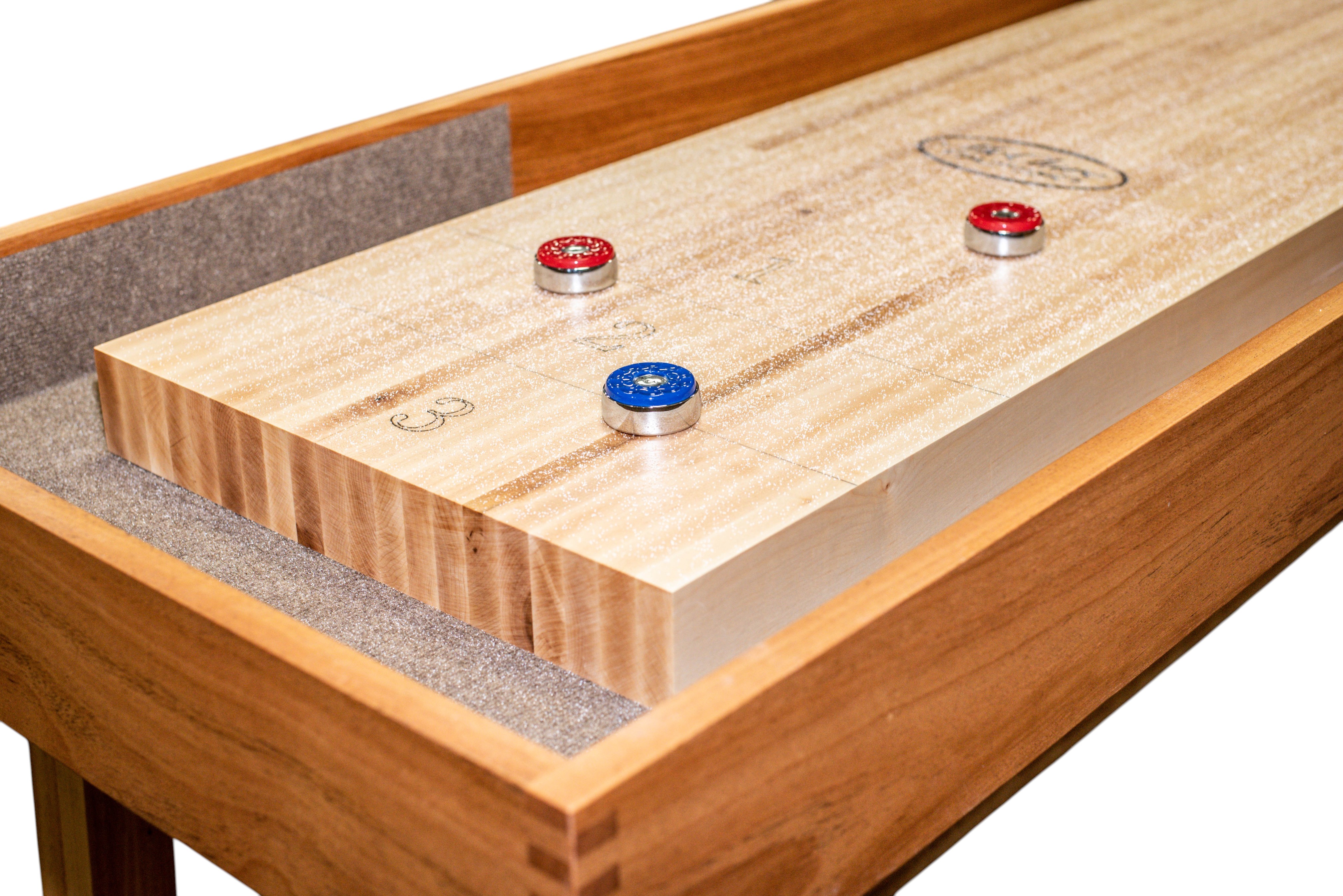 The overall clean, architectural style of the Oxford is achieved by the breathtaking construction that goes into every handmade detail. From the handcrafted dovetail joints at the corner to the premium inlayed carpet inside the solid mahogany cabinet, our Oxford shuffleboard table is a thing of beauty. The Oxford shuffleboard is one of our higher-end models. While this is a significant investment, it is justified by the superior quality of the materials and the meticulous care that goes into crafting each of these shuffleboard tables by hand.