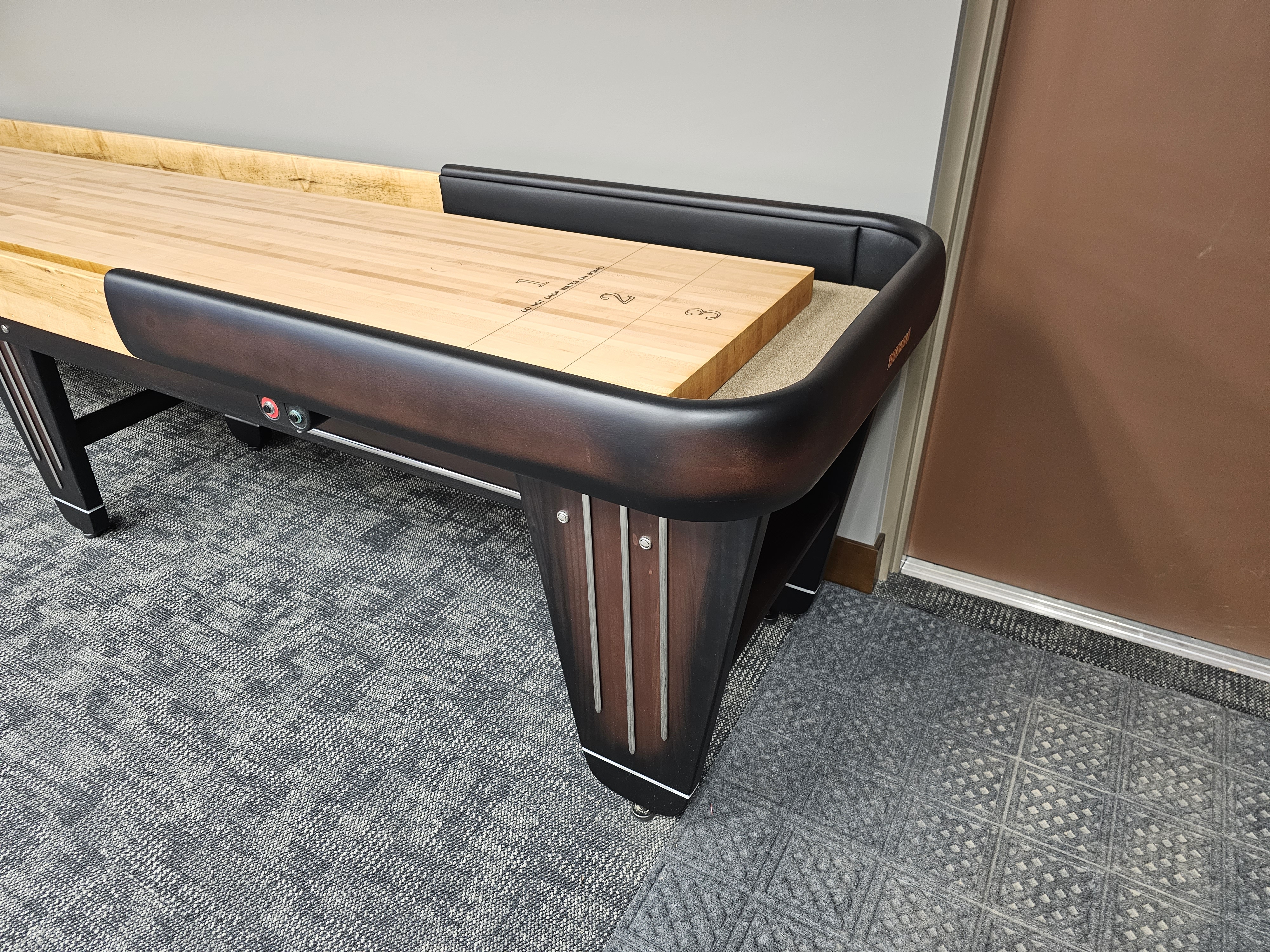 All tables are custom-made in Michigan at our own factory. Each Rock-Ola table is built to order. The new walnut shuffleboard table is available in sizes ranging from 12 to 22 feet. We recommend finishes like Traditional Chestnut, Deer Creek, or Traditional Mahogany, but we can match the finish to suit your game room.